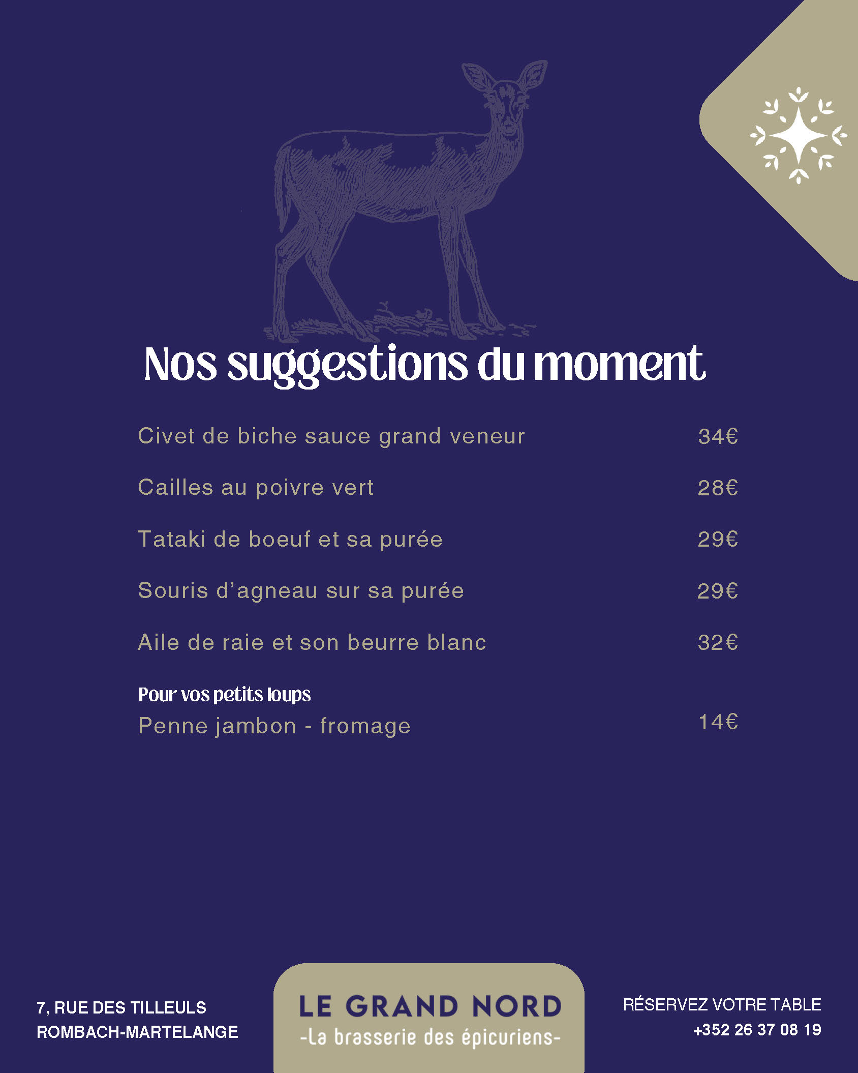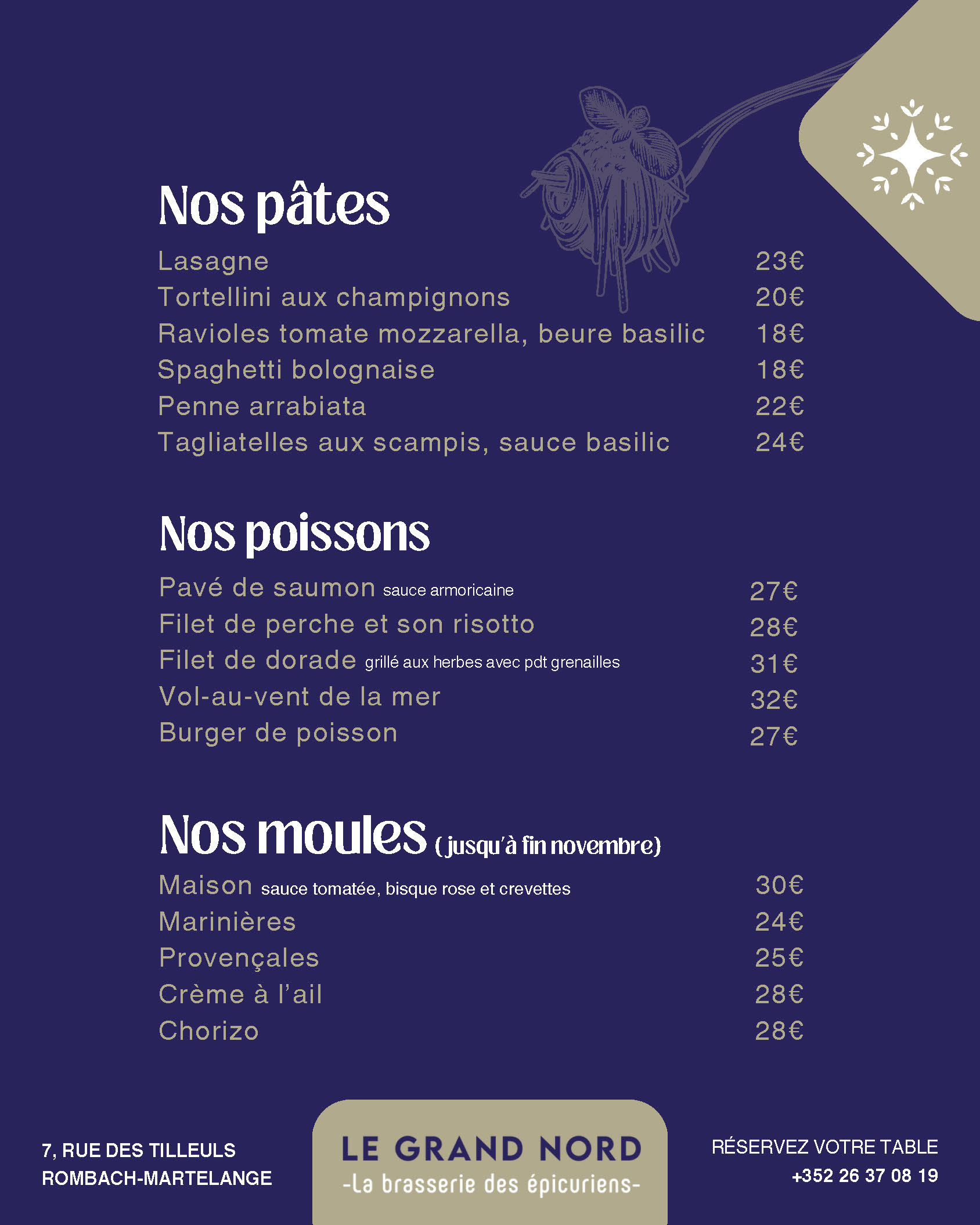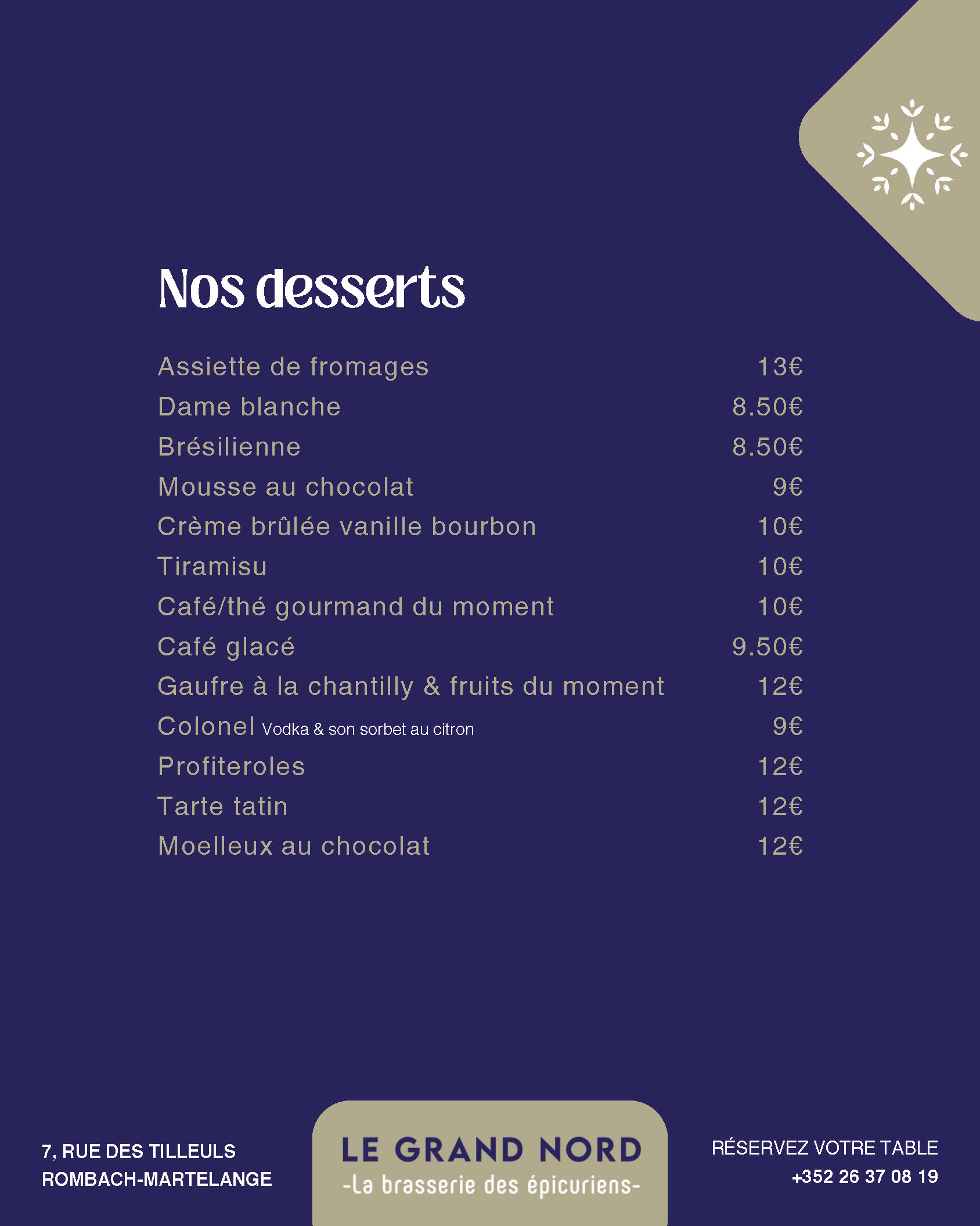 Que ce soit pour un déjeuner décontracté, un dîner raffiné ou simplement un moment autour d’un apéritif, le Grand Nord est l’adresse incontournable pour les amateurs de plaisirs culinaires. Pensez à réserver votre table et à venir découvrir notre carte qui change au gré des saisons et des inspirations du chef